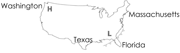 According to the weather map, which state is likely experiencing calm weather?