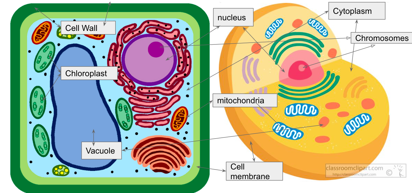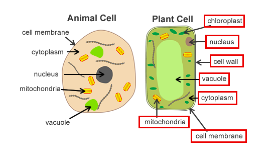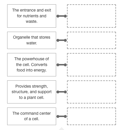 Cells have many organelles that do different jobs. The nucleus is the command center of the cell, telling the other organelles what to do. Chromosomes, which are made of DNA, are inside the nucleus. The cell membrane lets things in and out of the cell. The cytoplasm is a jelly like substance that holds all of the organelles in place. The vacuole is where the cell holds all of its food, water, and waste. It is bigger in a plant cell because the plant cannot move around to get water, so it must store water when it can. The mitochondria is the powerhouse of the cell, turning food into energy.