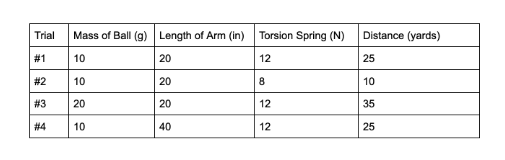 To correctly determine the effect of each independent variable, you have to compare data between 2 trials where ONLY one independent variable changed and the others stayed the same. Choose the two trials that provide evidence of how each independent variable effects the distance.