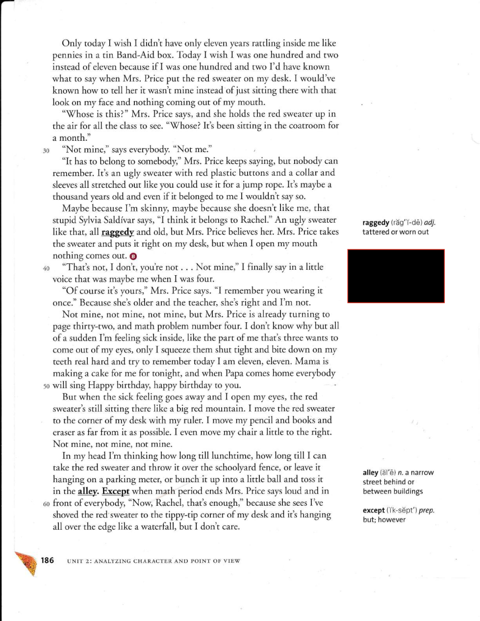 The narrator thought, "Today I wish I was one hundred and twoinstead of eleven because if I was one hundred and two I'd have knownwhat to say when Mrs. Price put the red sweater on my desk. I would'veknown how to tell her it wasn't mine instead of just sitting there with thatlook on my face and nothing coming out of my mouth."