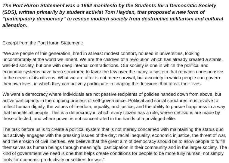 In the context of the Port Huron Statement, what does the term “participatory democracy” most likely mean?