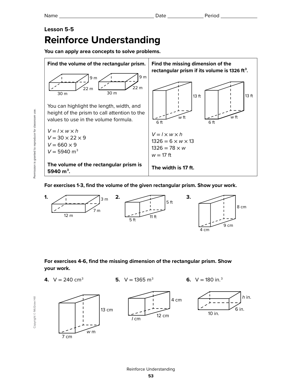 For exercise 1, find the volume of the given rectangular prism. Show your work.