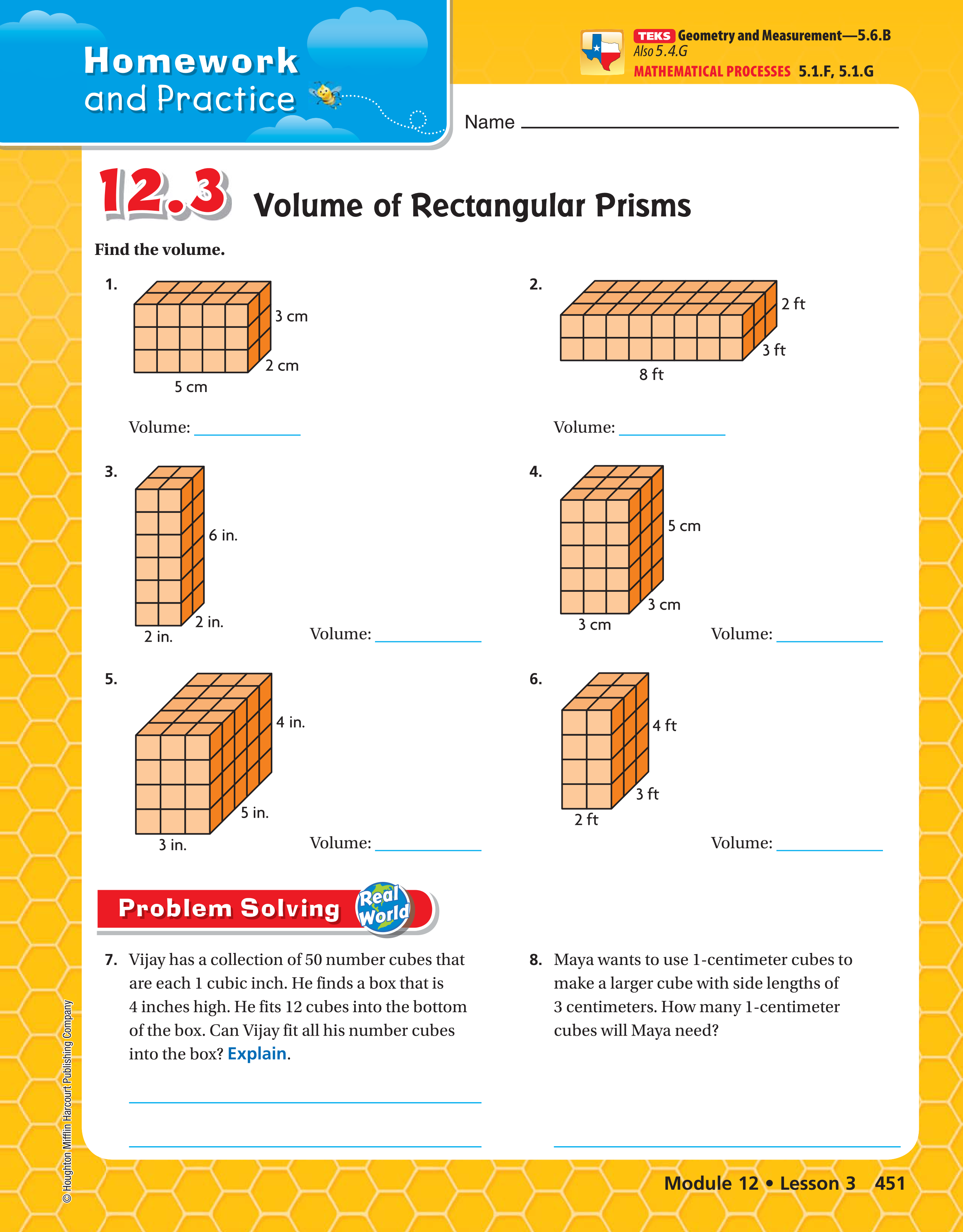 The length of the rectangular prism is __________. The width is __________. So, the area of the base is __________. Then, the volume of the prism is __________.