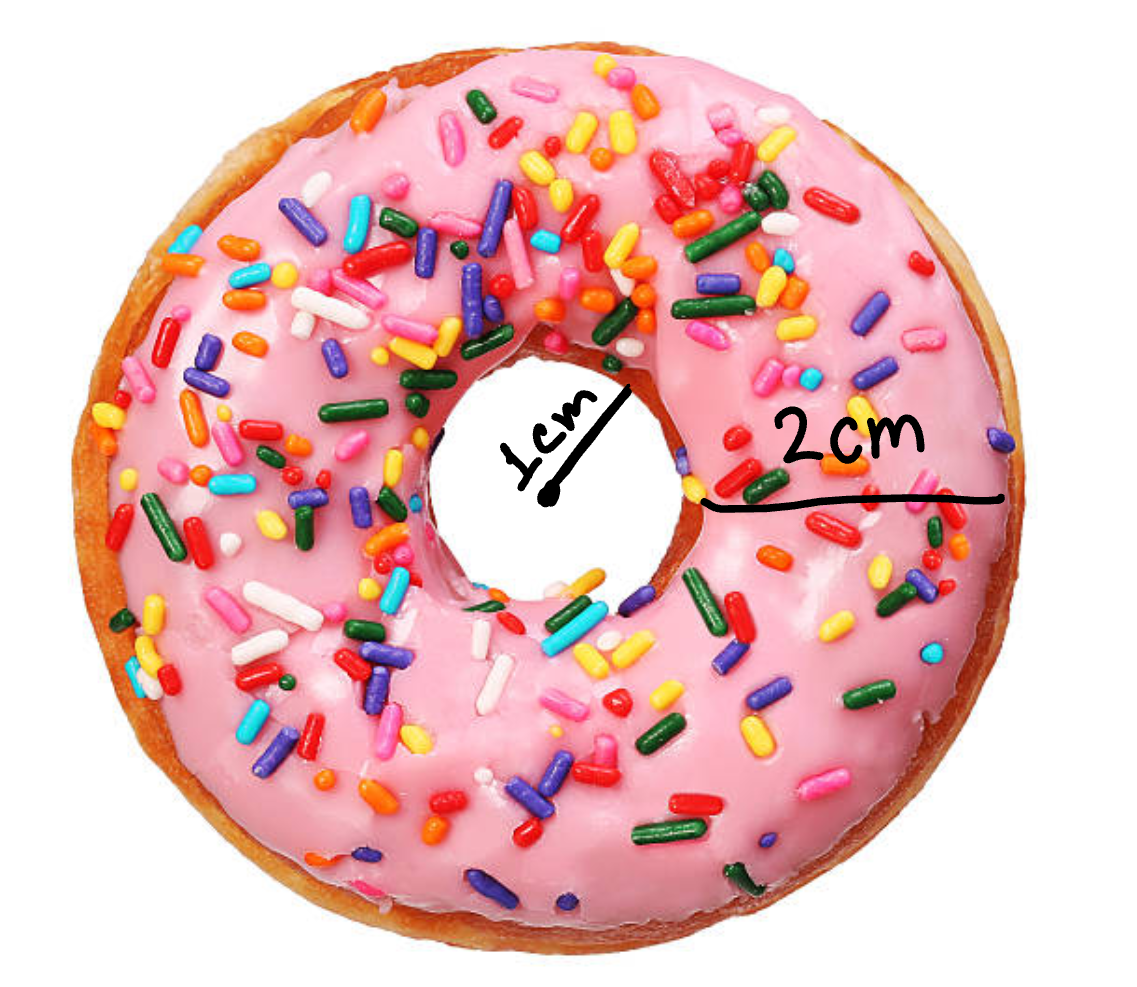 Analyse this donut. Describe how you can come up with an equation that would help you solve for the area of the frosting. (do not solve it, just describe an idea)