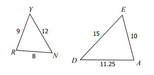 Determine if the triangles are similar, if possible, by AA~, SSS~, or SAS~. If similar, complete the similarity statement. If these are not similar type NA.