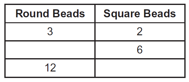 The table shows the ratio of round beads to square beads needed to make some jewelry.