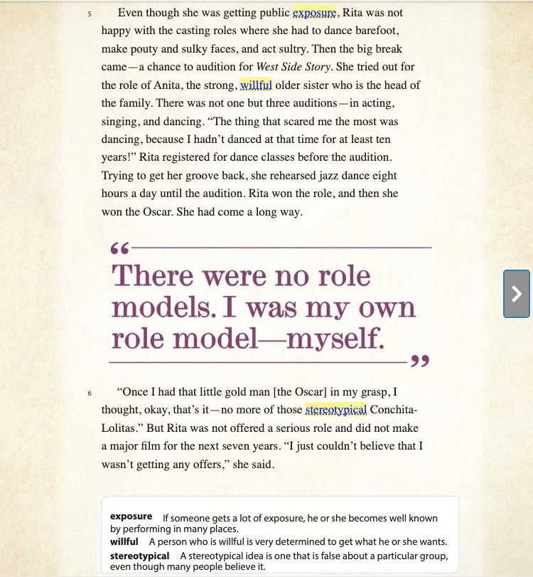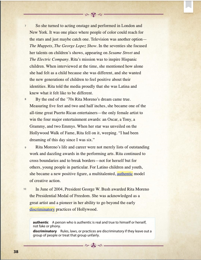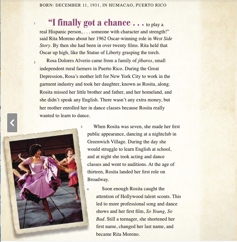 What does the biography reveal about the kind of person Rita Moreno is? What words would you use to describe her? Support your answer with text evidence.