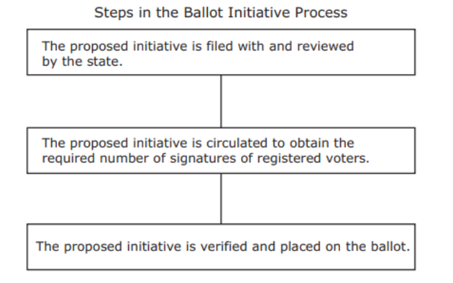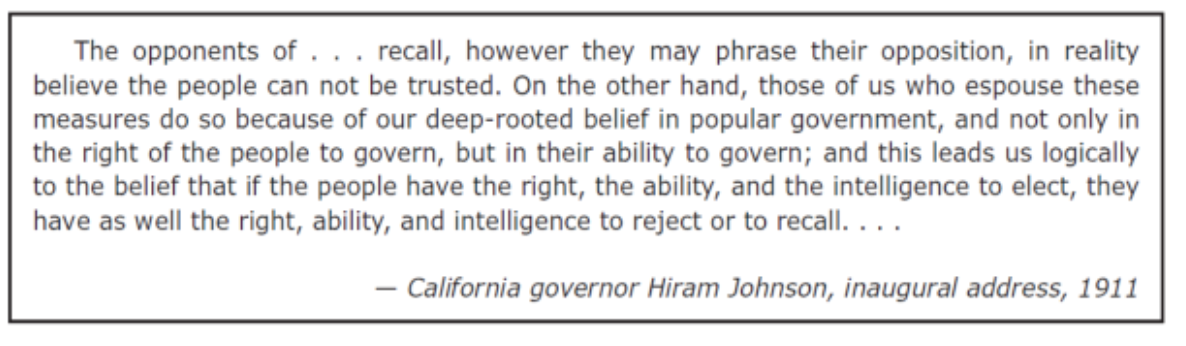 Direct democracy, for better or for worse, has become California's most distinctive and emblematic political institution. __________, __________, and__________ elections were added to the state constitution in 1911 as part of Governor Hiram Johnson's “progressive” movement, which redeemed the state from control by “The Octopus”, meaning the Southern Pacific Railroad monopoly that had a stranglehold on the state's economy and government.