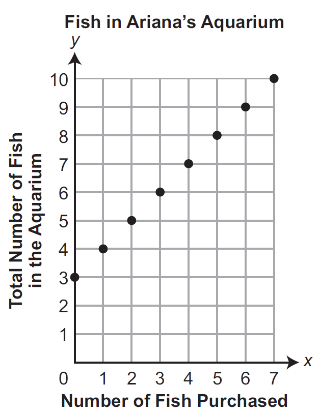 Ariana was given 3 fish for her birthday. Ariana decides to purchase more fish. The graph shows the total number of fish Ariana has in her aquarium after she purchases more fish. What is the dependent variable in this situation?
