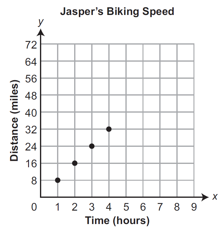 Jasper is riding a bicycle at a constant speed. The graph shows the relationship between the number of hours Jasper spends biking and the distance he bikes.