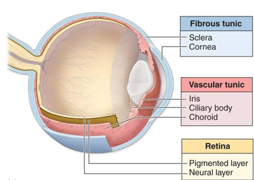 Identify and explain the three layers of the eyeball—fibrous tunic, vascular tunic, and nervous tunic—detailing the specific parts such as the sclera, cornea, choroid, ciliary body, iris, lens, pupil, and retina, as well as their respective functions in vision.