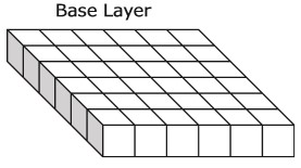 Hollis put a layer of boxes in the bottom of a container. Each box has a volume of 1 cubic foot. The base layer of boxes in the container is shown.