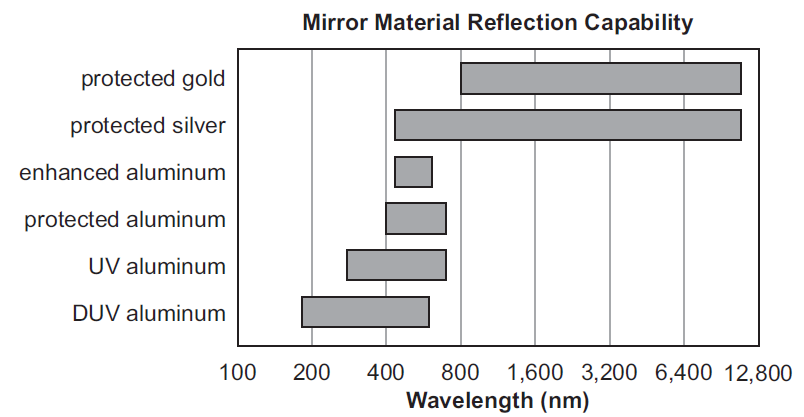 In the graph, “protected” means that an additional coat of a tough material protects the metal coating, and “enhanced” means an additional coat of a different material increases the range of wavelengths the coating can reflect.