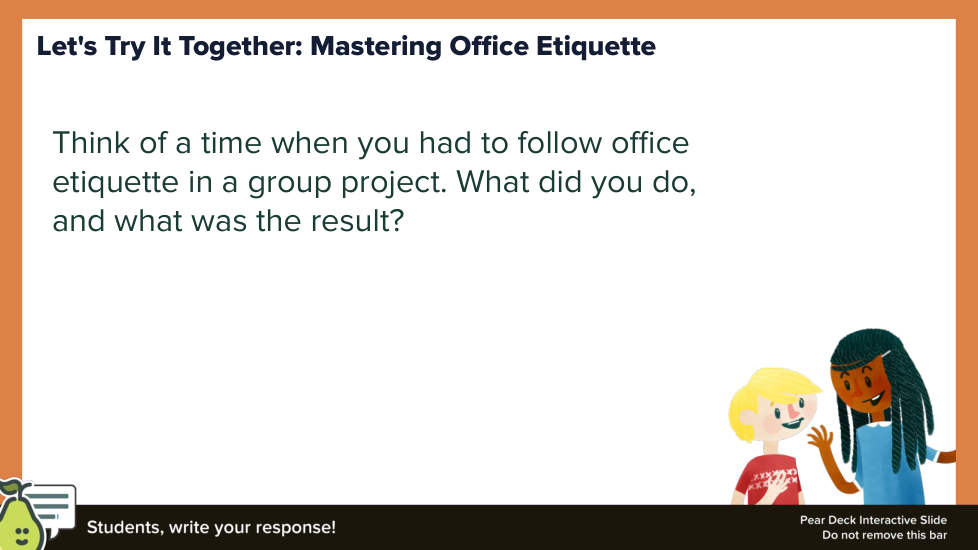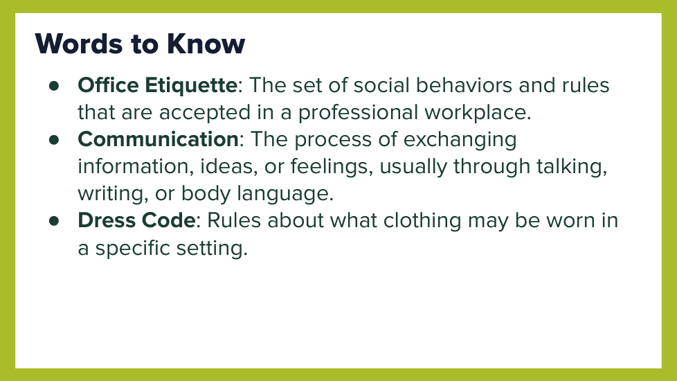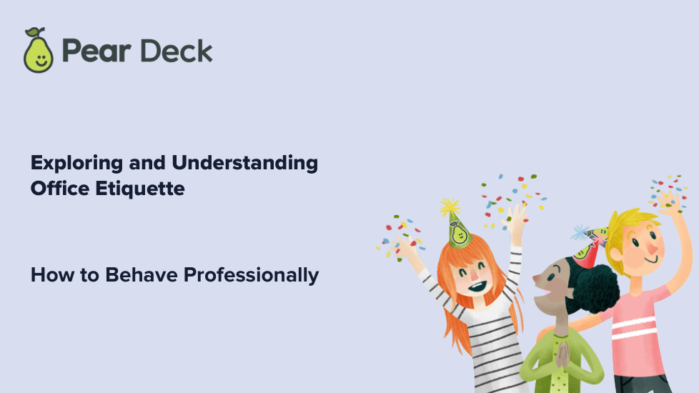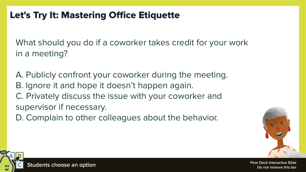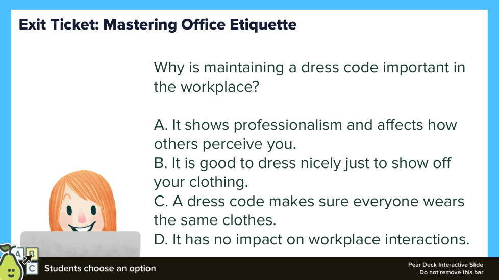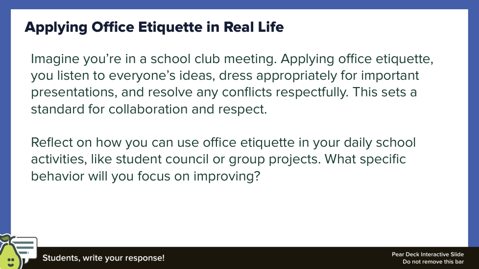 This formative lesson, "Office Etiquette - A Deep Dive," is designed to help students analyze and apply professional workplace norms. Through a variety of activities, students will explore the key principles of office etiquette, practice responding to different workplace scenarios, and reflect on their own professional behavior. The lesson uses app.formative.com to facilitate student responses, collaboration, and reflection.