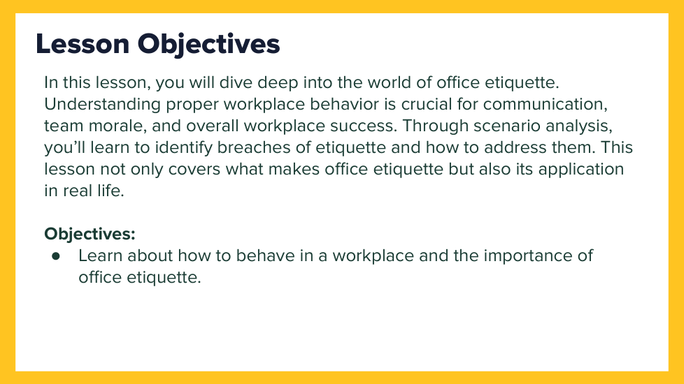 Provocative Opening: The lesson begins with a reflective question, prompting students to think about times they have witnessed or experienced a breach of office etiquette and the impact it had on the situation.