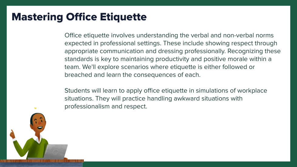 This lesson uses a variety of methods, including discussion, scenario analysis, role-playing, and reflection to ensure students develop a comprehensive understanding of office etiquette and how to apply it in their professional lives. It encourages students to think critically about the impact of their behavior on others and promotes a collaborative and respectful learning environment.
