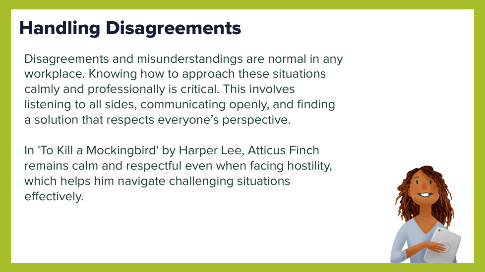 Key Takeaways: The lesson emphasizes understanding expected workplace norms, the importance of verbal and non-verbal communication, how to show respect and professionalism, techniques for addressing disagreements, the importance of professional dress and appearance, and provides examples of good and bad office etiquette.