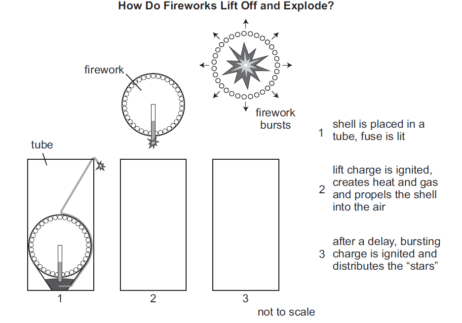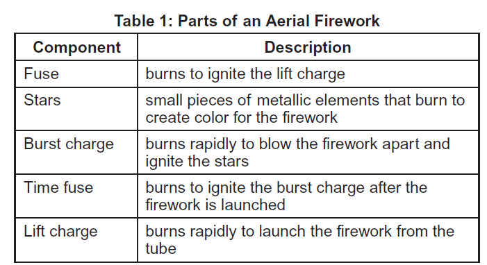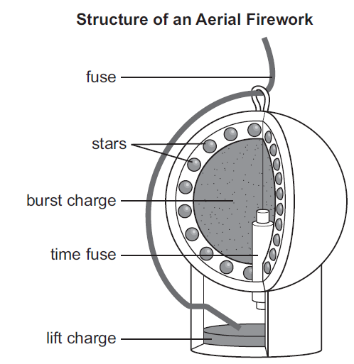 A group of students learned that fireworks that are launched from the ground into the air are called aerial fireworks. The basic structure of an aerial firework is shown in this diagram.