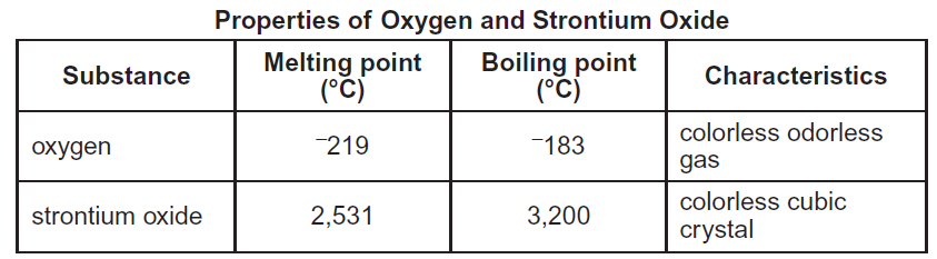 The data table below shows some properties of oxygen and strontium oxide, which is produced when strontium burns.