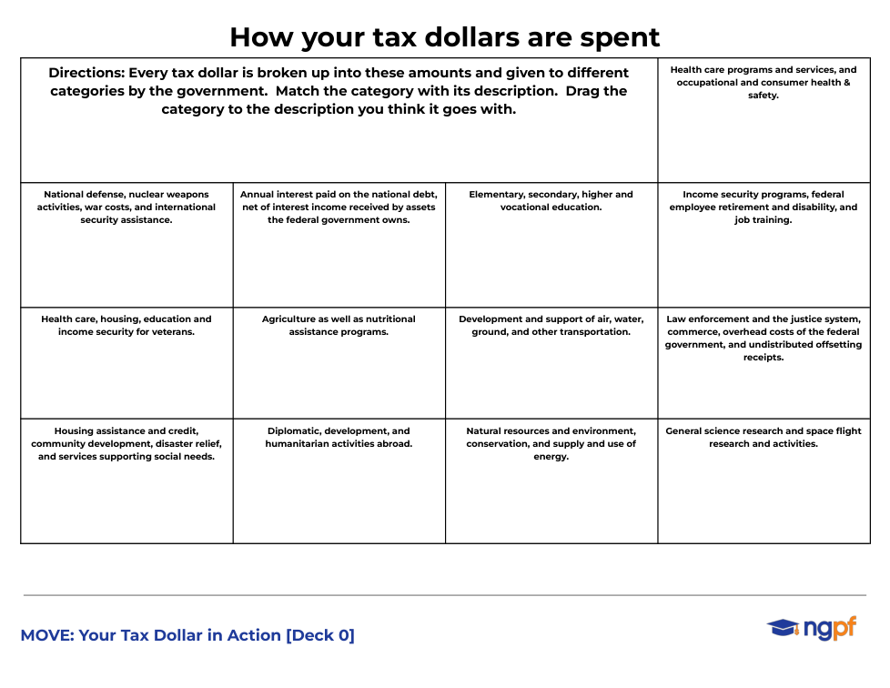 Now that you know what the categories are, which ones do you think get the most money? Take a guess, match each category with the amount it gets from every tax dollar.