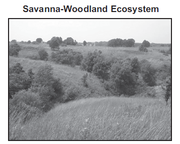 Some ecosystems have both open grassland areas and forests. These are called savanna-woodland ecosystems. The variety of trees and other plants supports a wide variety of animals.