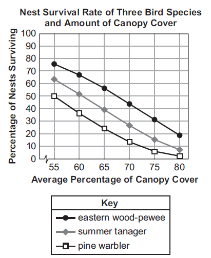 The graph below shows how the amount of canopy cover affected the nest survival rate of the three canopy-nesting bird species in the study. The canopy cover is the area occupied by branches and leaves at the tops of trees.