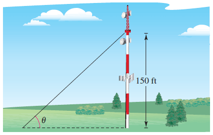 A guy wire is a wire used to anchor a tower or other structure in place. In the picture below, a guy wire helps to anchor a cell phone tower in place. It is connected to the tower 150 feet above the ground. Round your answers to the nearest tenth of a foot.