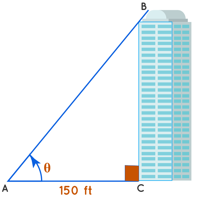 In the picture, what is the line of sight distance from a person standing on the ground at point A to a person on the observation deck at the top of the building if the angle of the person looking up is 66\degree?