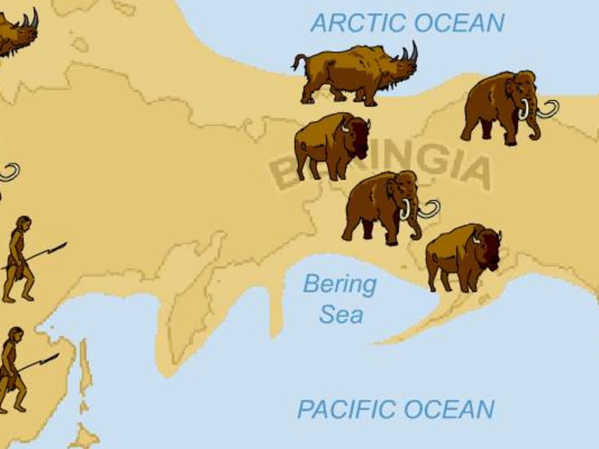 Which two (2) continents did the Bering Land Bridge connect to allow early humans to migrate during the Ice Age?