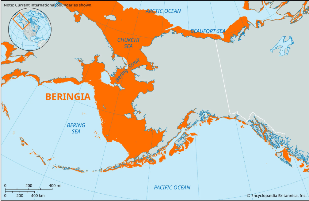 Correctly label the two modern-day locations (in grey) where the Bering Land Bridge was located in: