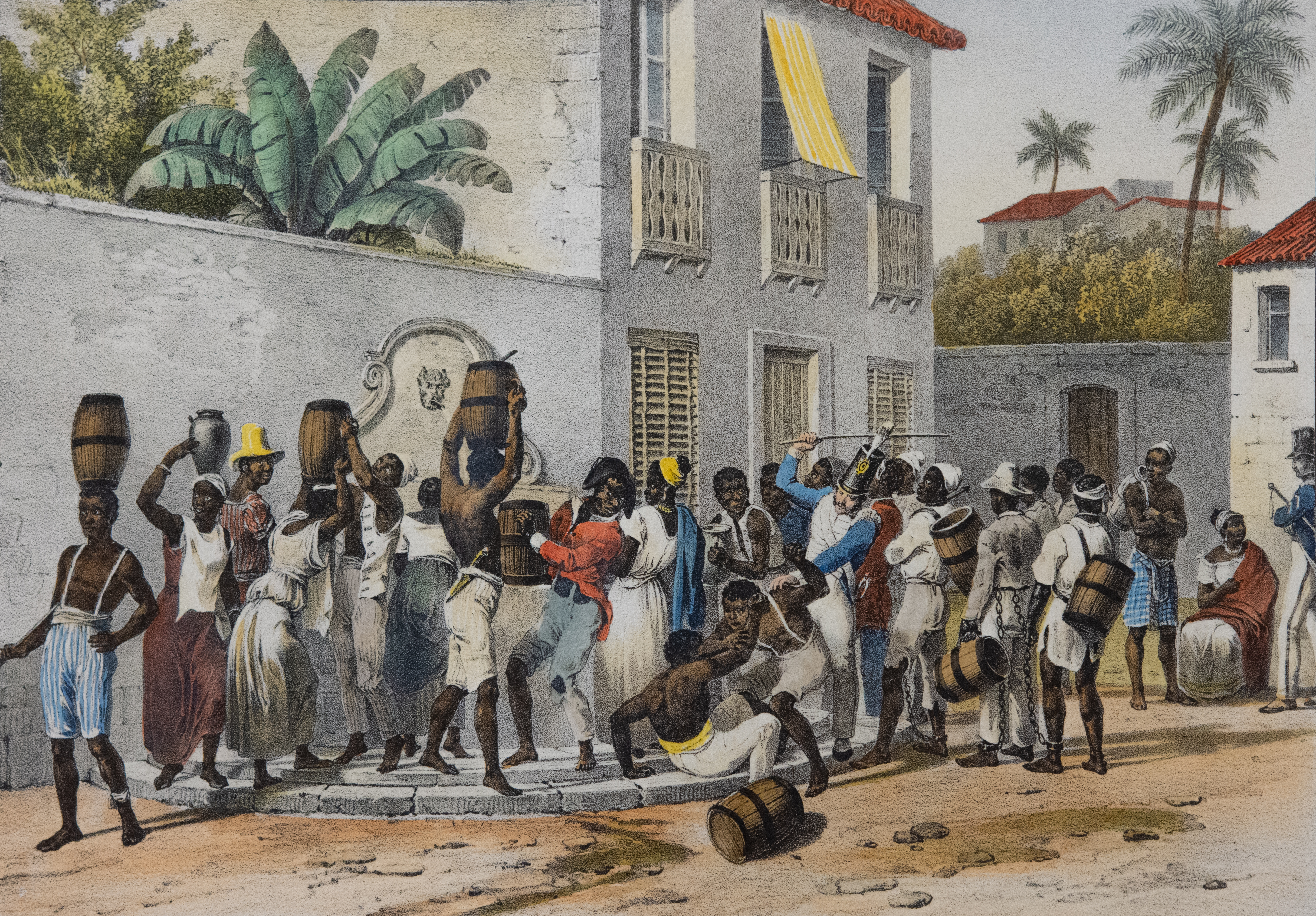 "Na colônia, ainda no século XVI, os portugueses já haviam dado início ao tráfico negreiro, atividade comercial bastante lucrativa. Os traficantes de escravos negros, interessados em ampliar esse rendoso negócio, firmaram alianças com os chefes tribais africanos. Estabeleceram com eles um comércio baseado no escambo, no qual trocavam tecidos de seda, joias, metais preciosos, armas, tabaco, algodão e cachaça por africanos capturados em guerras com tribos inimigas.