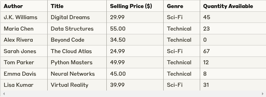 You were recently employed as a data analyst and have a need to calculate the total amount of money the store will receive if they sell all of the available Technical books. Which columns in the database can be ignored and still allow you to perform this calculation