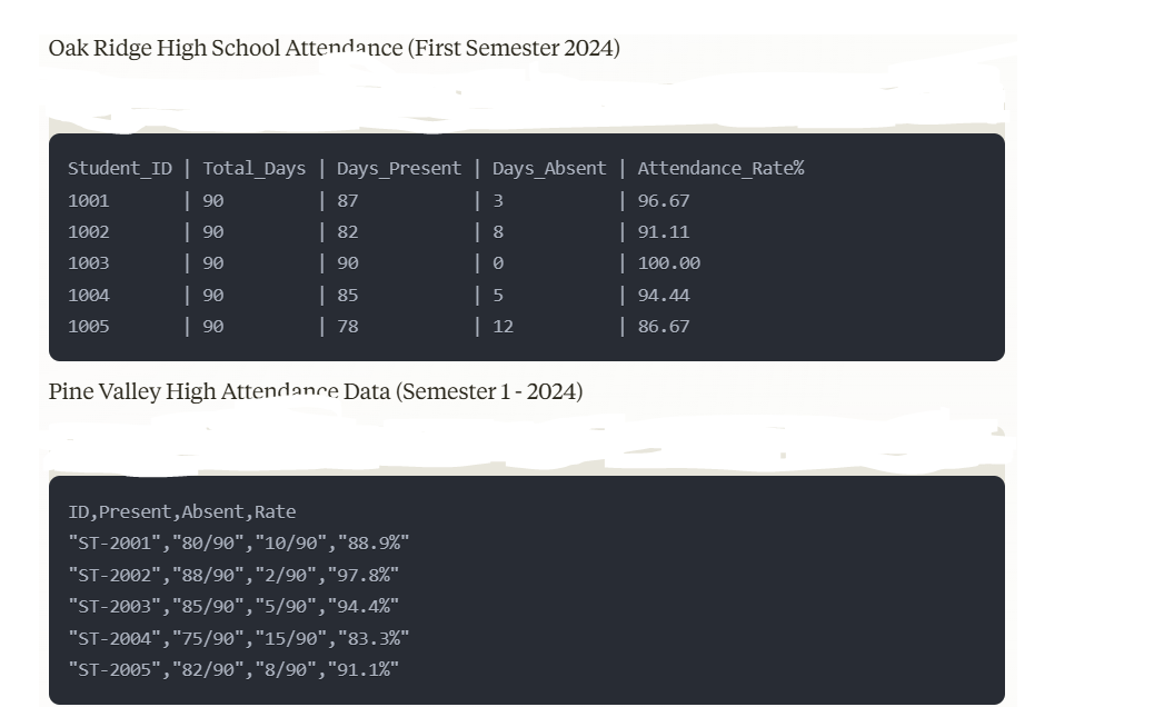 Student_ID, Total_Days, Number_Days_Present, Number_Days_AbsentAttendance_Rate