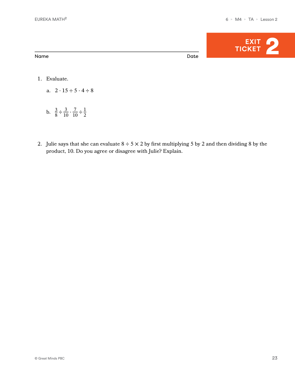 Julie says that she can evaluate 8 / 5 X 2 by first multiplying 5 by 2 and then dividing 8 by the product, 10. Do you agree or disagree with Julie? Explain.