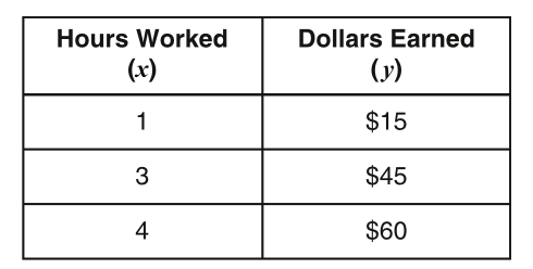 Kelli recorded the amount of money she earned (y) for hours worked (x), in the table shown. Select the words that correctly complete the sentences.