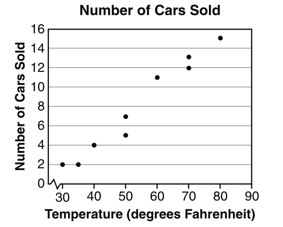 A car sales business is analyzing the number of cars sold and the average daily high temperature. The data is shown on the graph below. Which statement is correct based on the data?