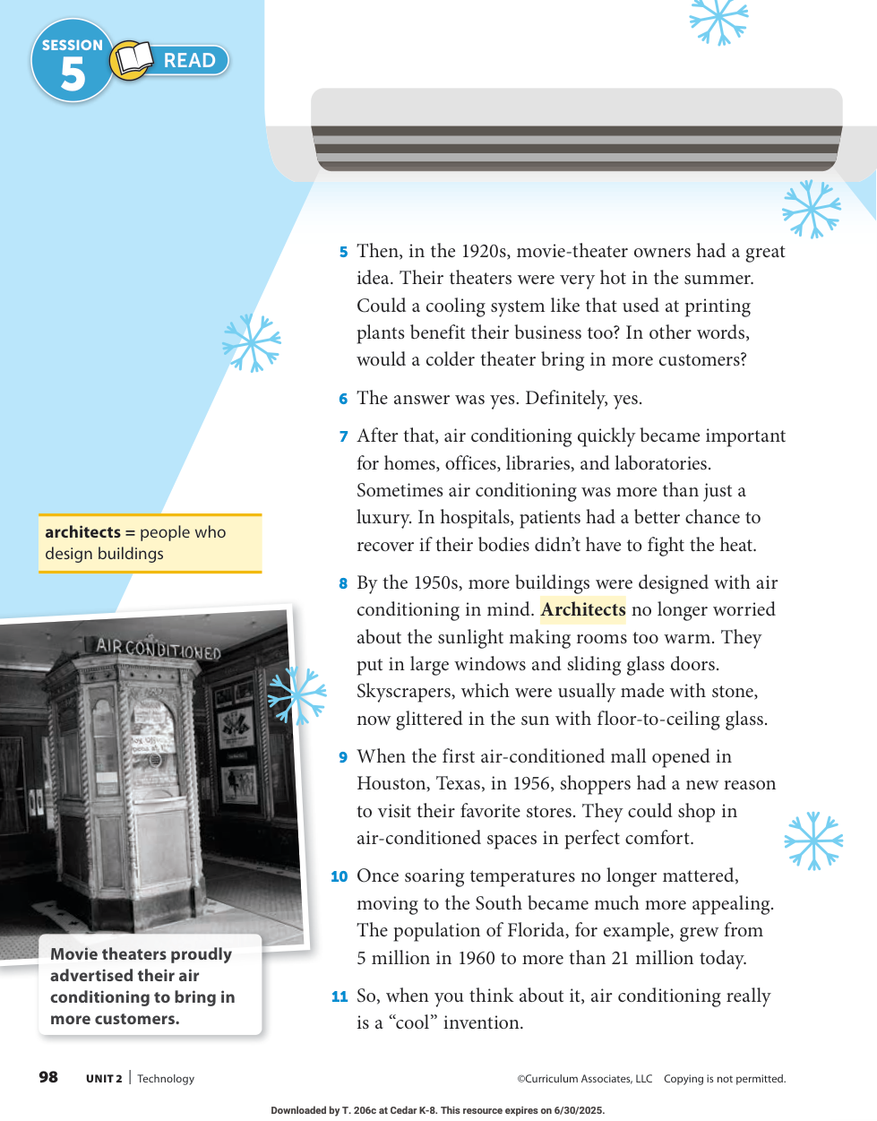 How did air conditioning improve movie theaters and shopping malls? Use details from the text to support your response.