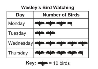 Wesley goes bird watching each day for four days. He makes a picture graph to show how many birds he sees on each day.