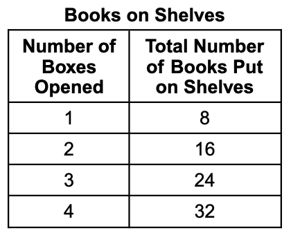 Nolan opens 5 boxes of books for a book fair. Each box has the same number of books in it. Nolan puts all the books from each box on shelves. He makes a table to show how many books he has put on shelves for the first 4 boxes.