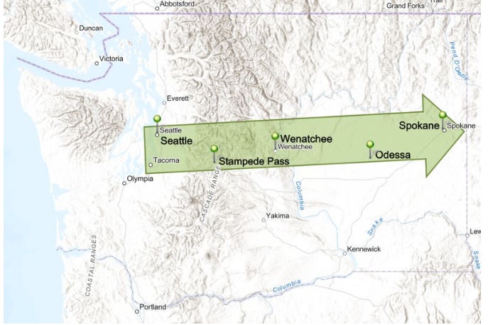 Why do you think most of the precipitation is falling at Stampede Pass and very little is falling further inland?