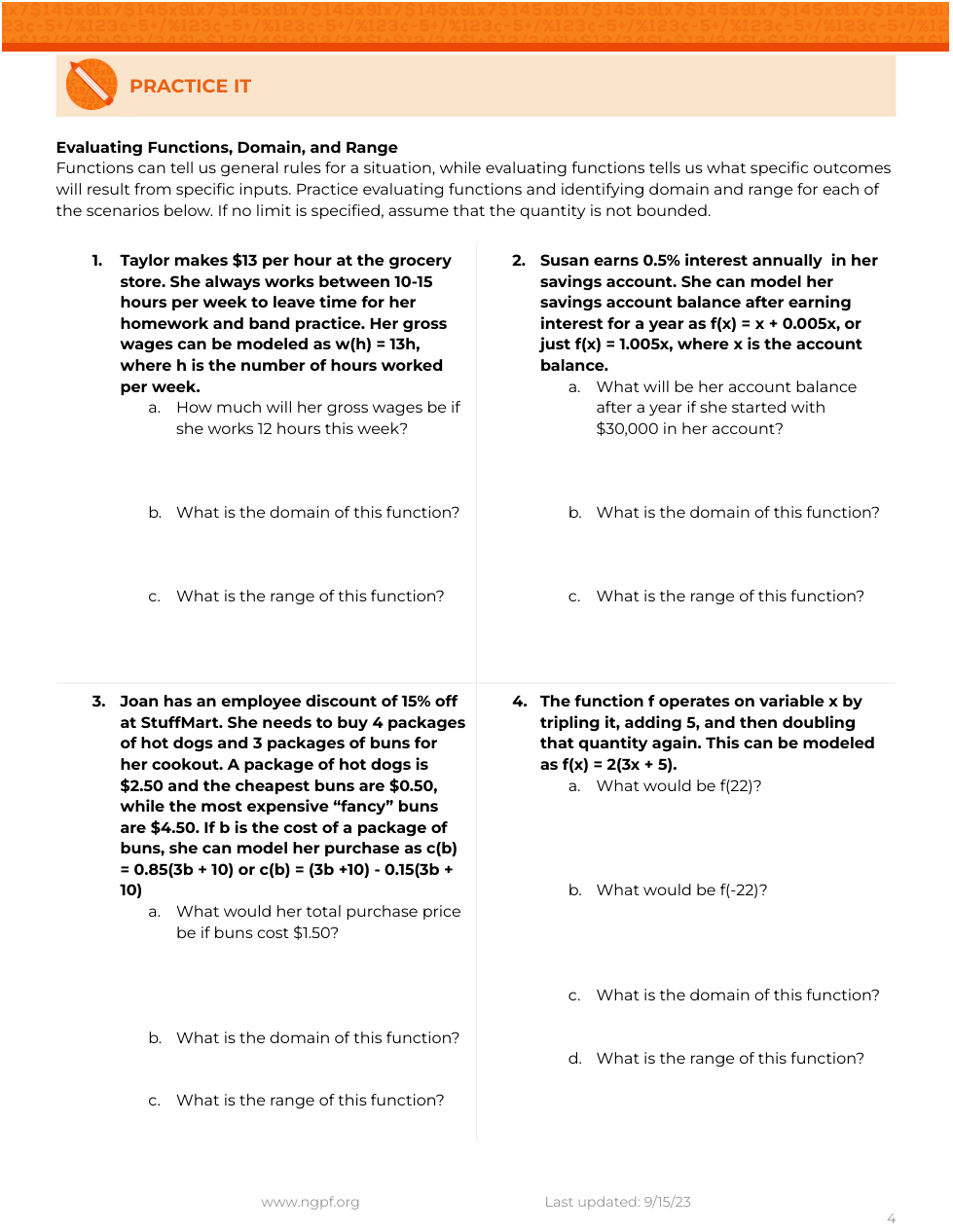Same function as above - The function f operates on variable x by tripling it, adding 5, and then doubling that quantity again. This can be modeled as f(x) = 2(3x + 5).