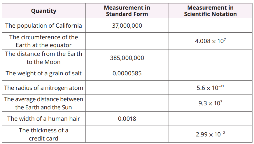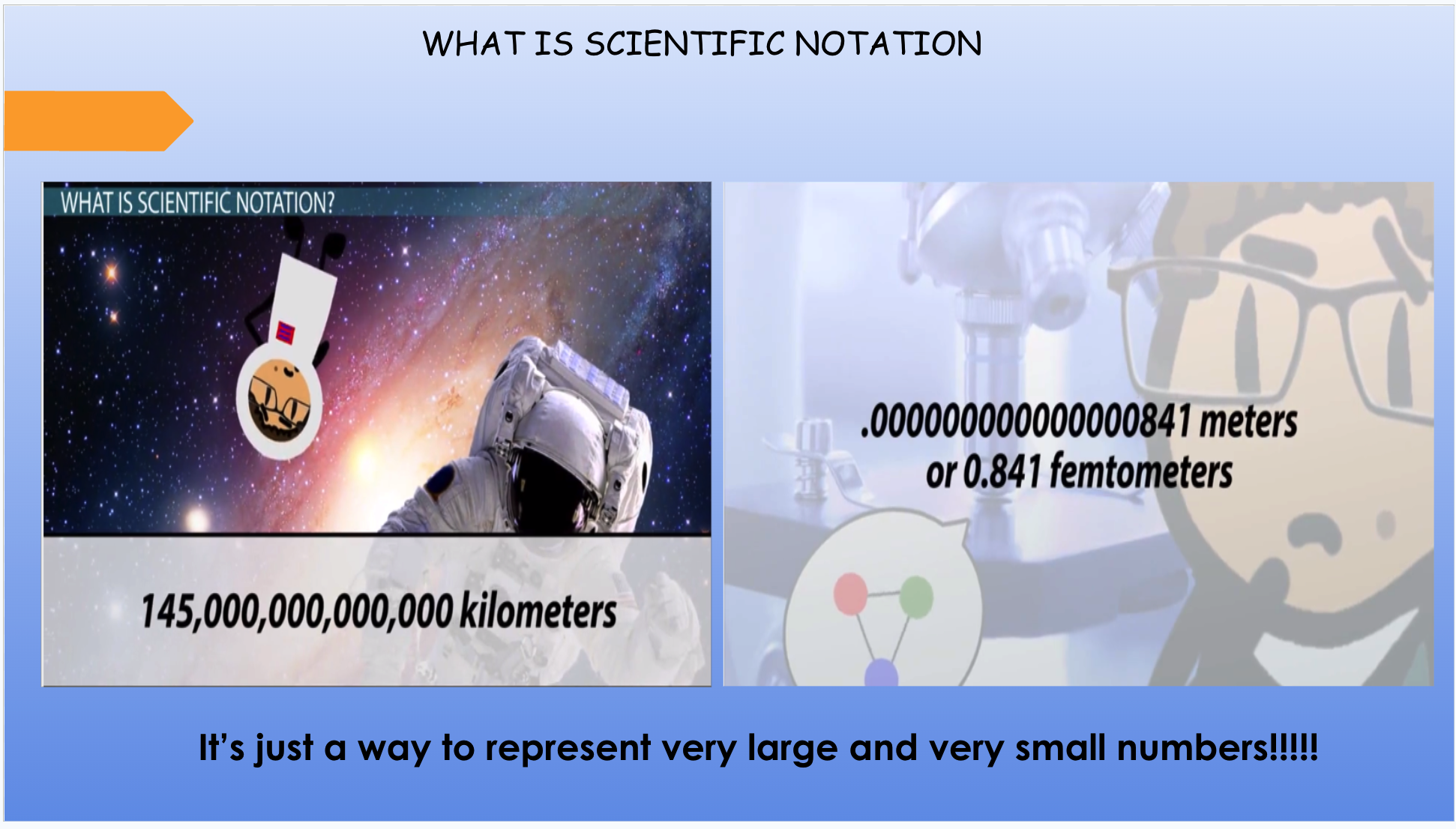 Sometimes it is not convenient to write a number in standard notation(the notation used to write numbers, Ex. 1,520,000; 0.00052 etc.) especially when the numbers are very large or very small numbers with many decimal places or zeros. You can rewrite a very large and very small number in a more convenient way called scientific notation.