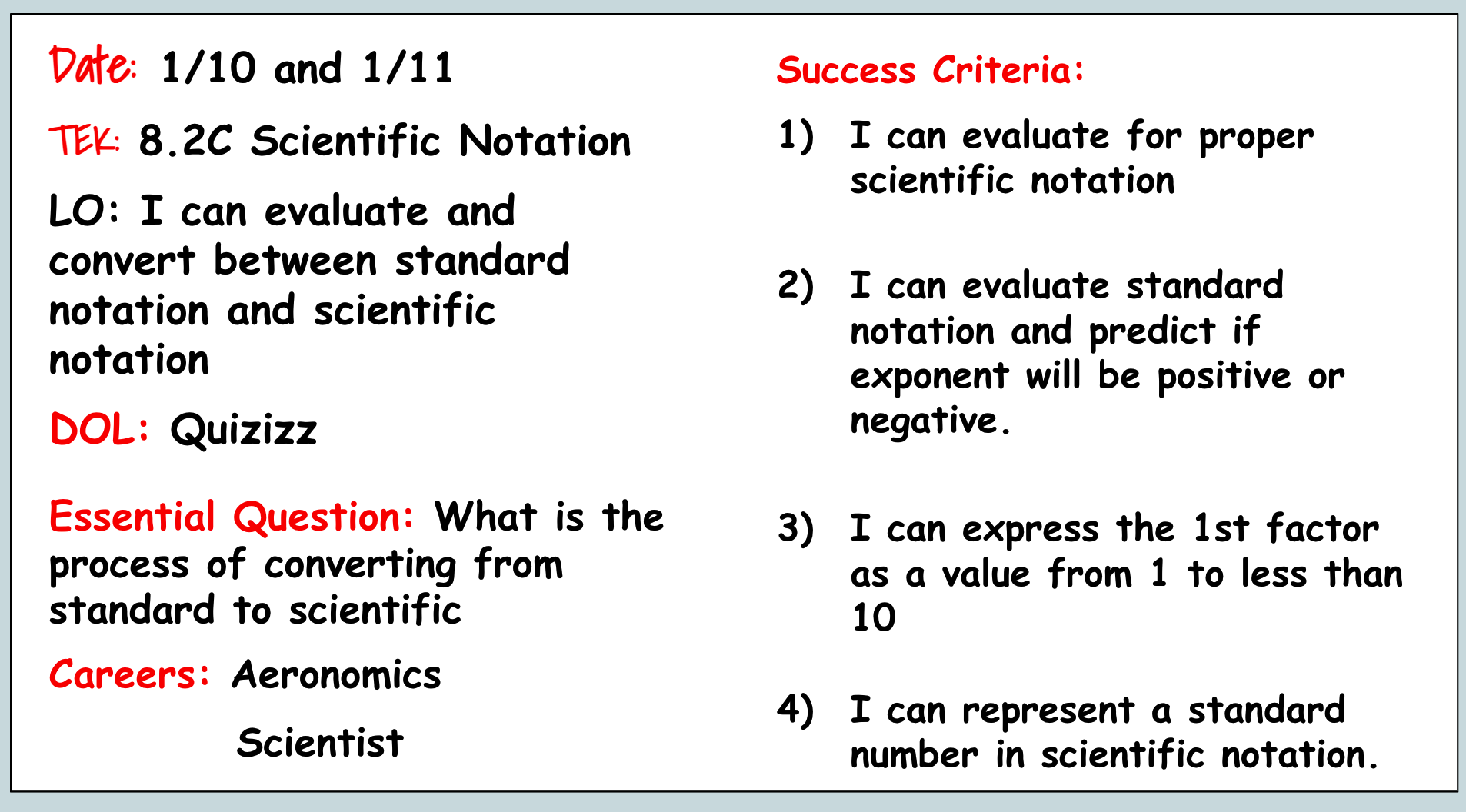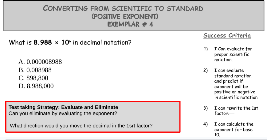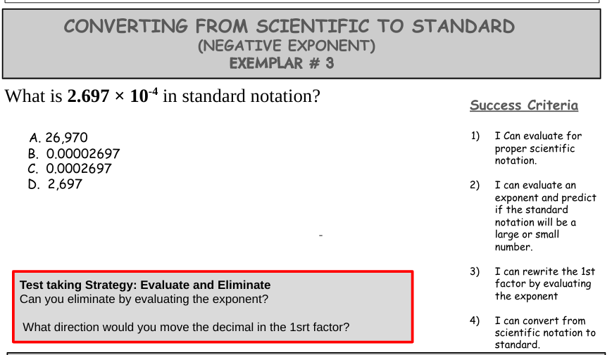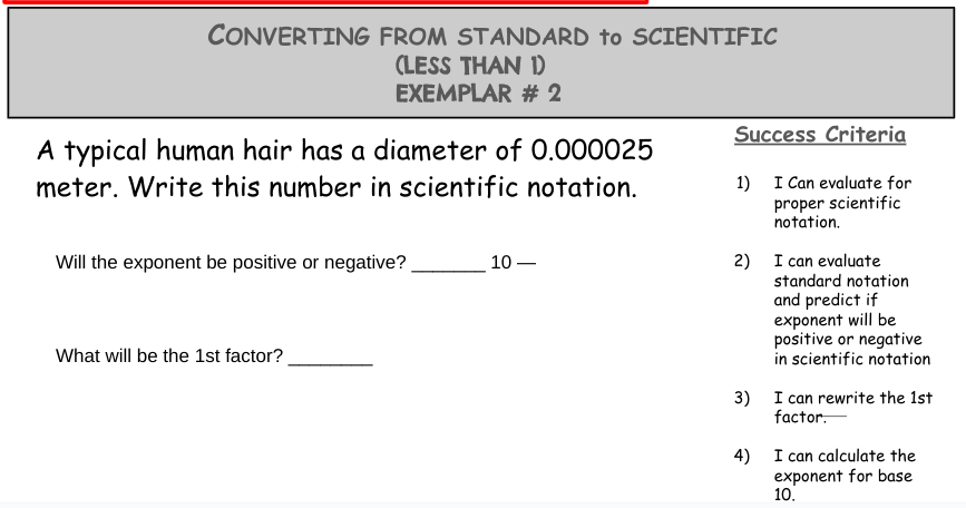 2) Determine if the exponent will result in a number greater than 1 or less than 1 when converted into Standard Notation.
