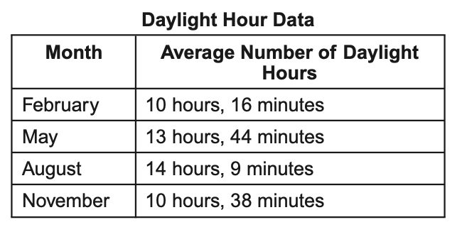 A student in Missouri records the average number of daylight hours during four months of the year. The results are shown in the data table below