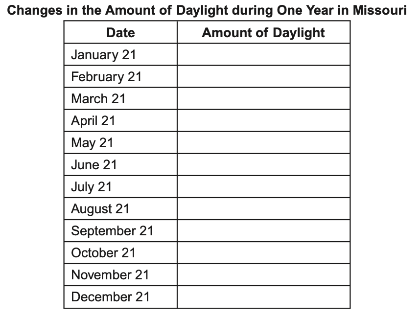 A student is investigating how the amount of daylight changes with the time of year in Missouri. The data table shown is used by the student in the investigation.