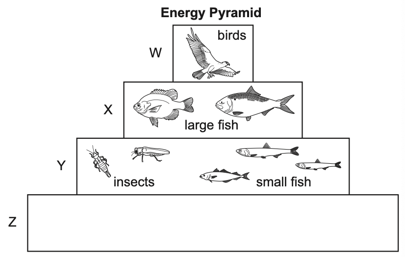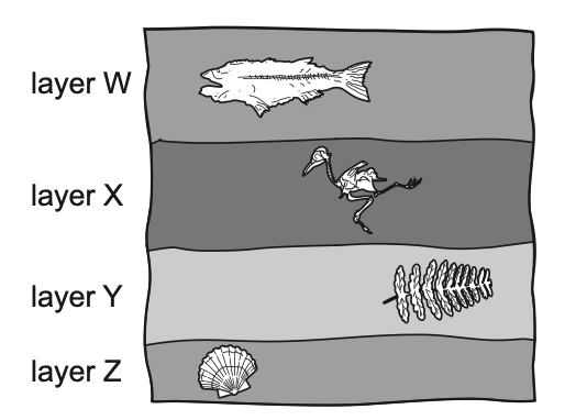A scientist observes some layers of sedimentary rock on a cliff. The layers of sedimentary rock contain fossils. The scientist makes a drawing of the observations. The scientist’s drawing is shown.