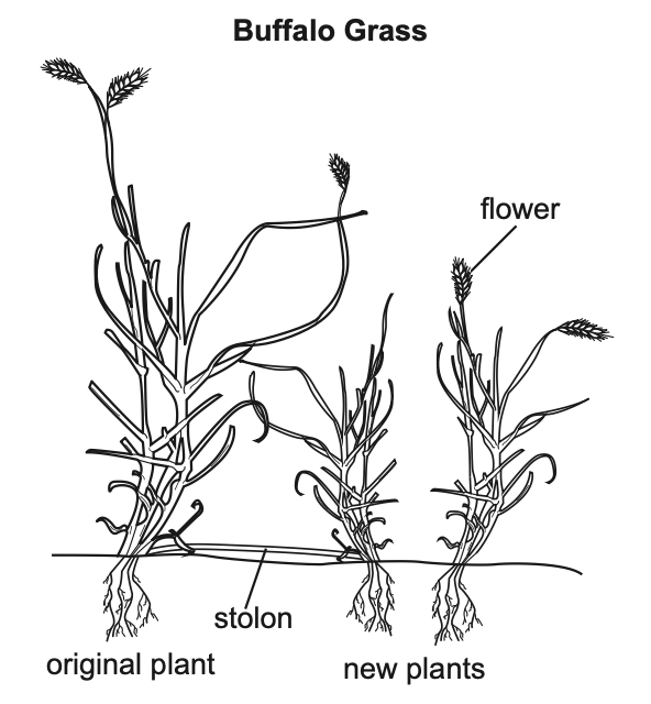 Students decide to replace part of a school’s grass lawn with native plants. Healthy grass lawns usually need a lot of care to be healthy. Native plants need less care because they are adapted to grow well in local conditions. The students decide to use buffalo grass, which is native to the school area. Buffalo grass needs less water and fertilizer than other types of grass and can live through periods without rain. Like other types of grass, buffalo grass spreads out to cover the ground. Aboveground stems, called stolons, grow outward from existing grass plants. New leaves and roots grow from the stolons, forming new plants. Buffalo grass only grows 8–10 inches high and the leaves tend to topple over and look short, so it requires less mowing as well.