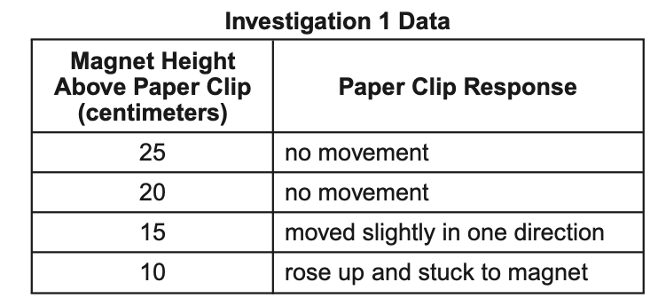 A student performed two investigations with paper clips. During the first investigation, the student held a horseshoe magnet at different heights above the paper clip. The data are shown in the table below.