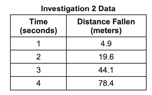 During the second investigation, the student researched data on the Internet about how far a paper clip would fall each second after being dropped from a height of 100 meters. The data are shown in the table below.