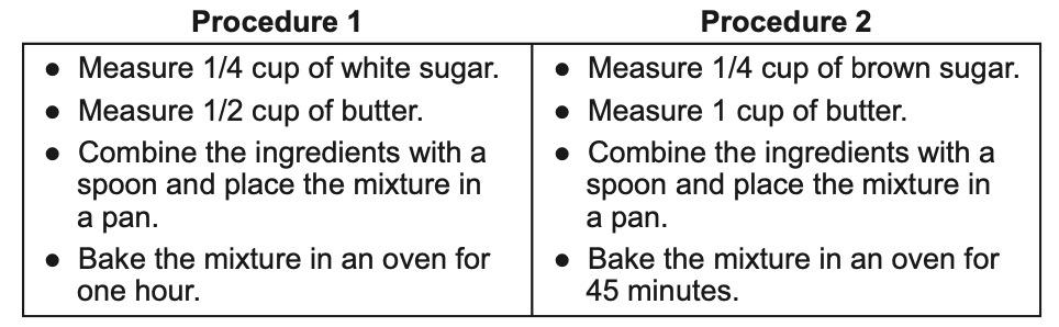 The student decides to perform a separate investigation to see how baking with white sugar compares to baking with brown sugar. The student performs the following two procedures.